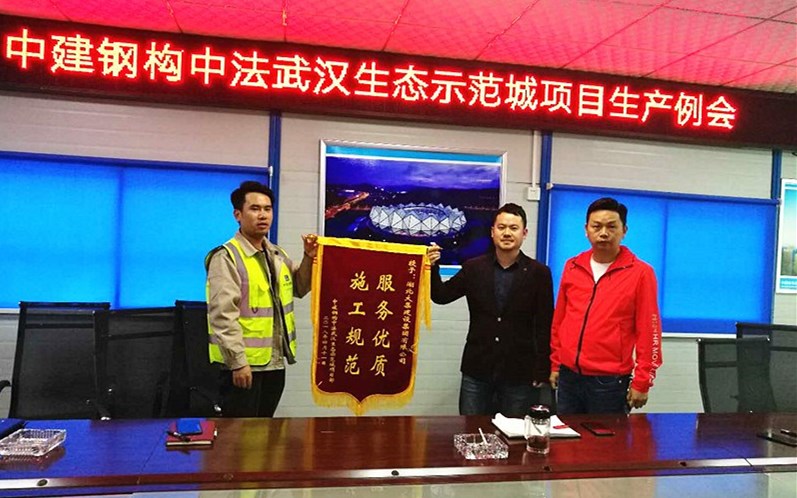 2018年4月13日,由集團(tuán)公司參與承建的中法新城規(guī)劃館項目獲得中建鋼構(gòu)嘉獎,授予“施工規(guī)范,服務(wù)優(yōu)質(zhì)”的錦旗,項目經(jīng)理徐斌和工程部副部長陳超共同接受了這一榮譽(yù)。