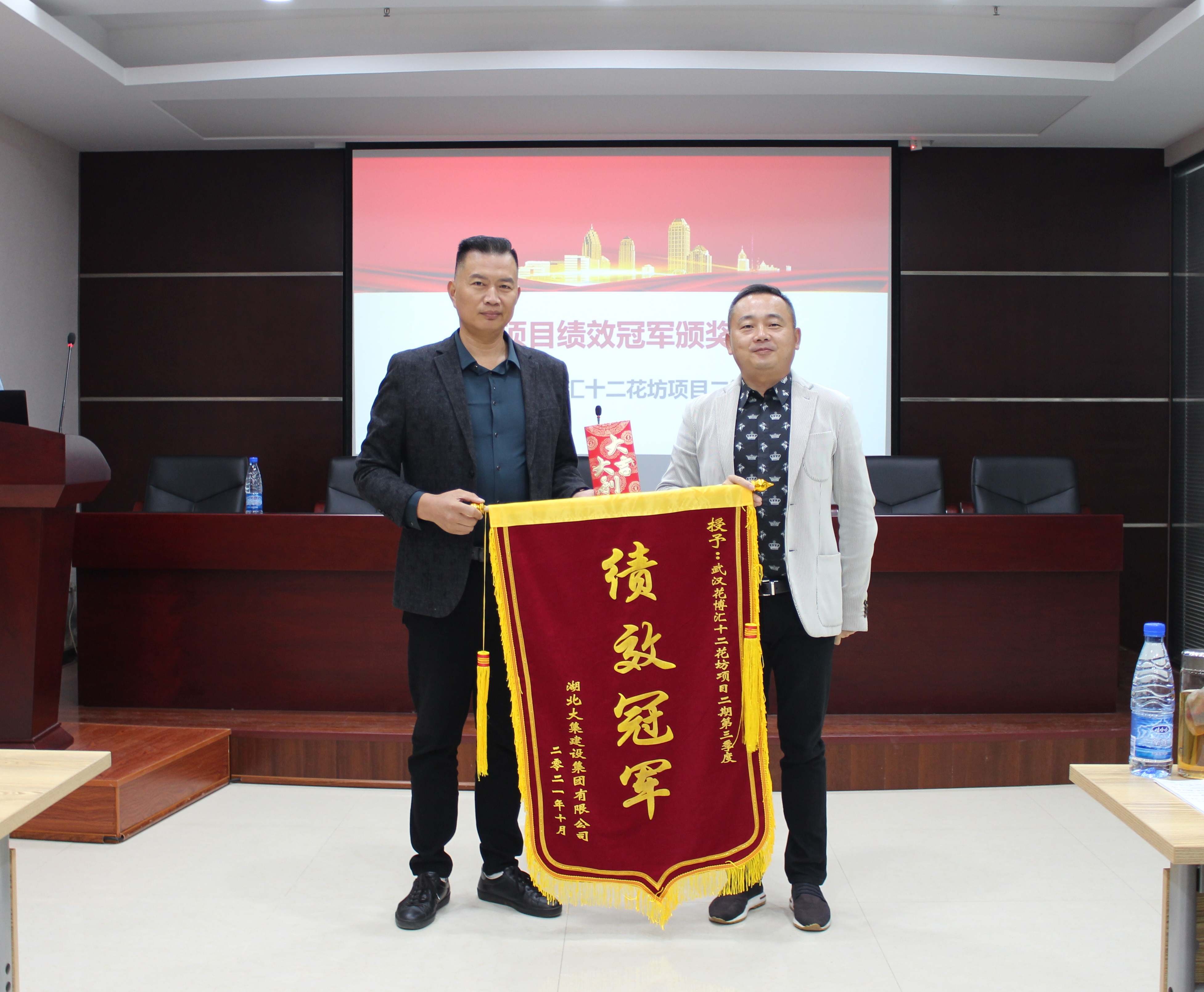 會議開始,行政部公布集團公司2021年第三季度項目績效考核結(jié)果,并由集團董事長徐濤為此次績效考核中的冠軍項目——花博匯十二花坊項目二期頒發(fā)錦旗和獎金。