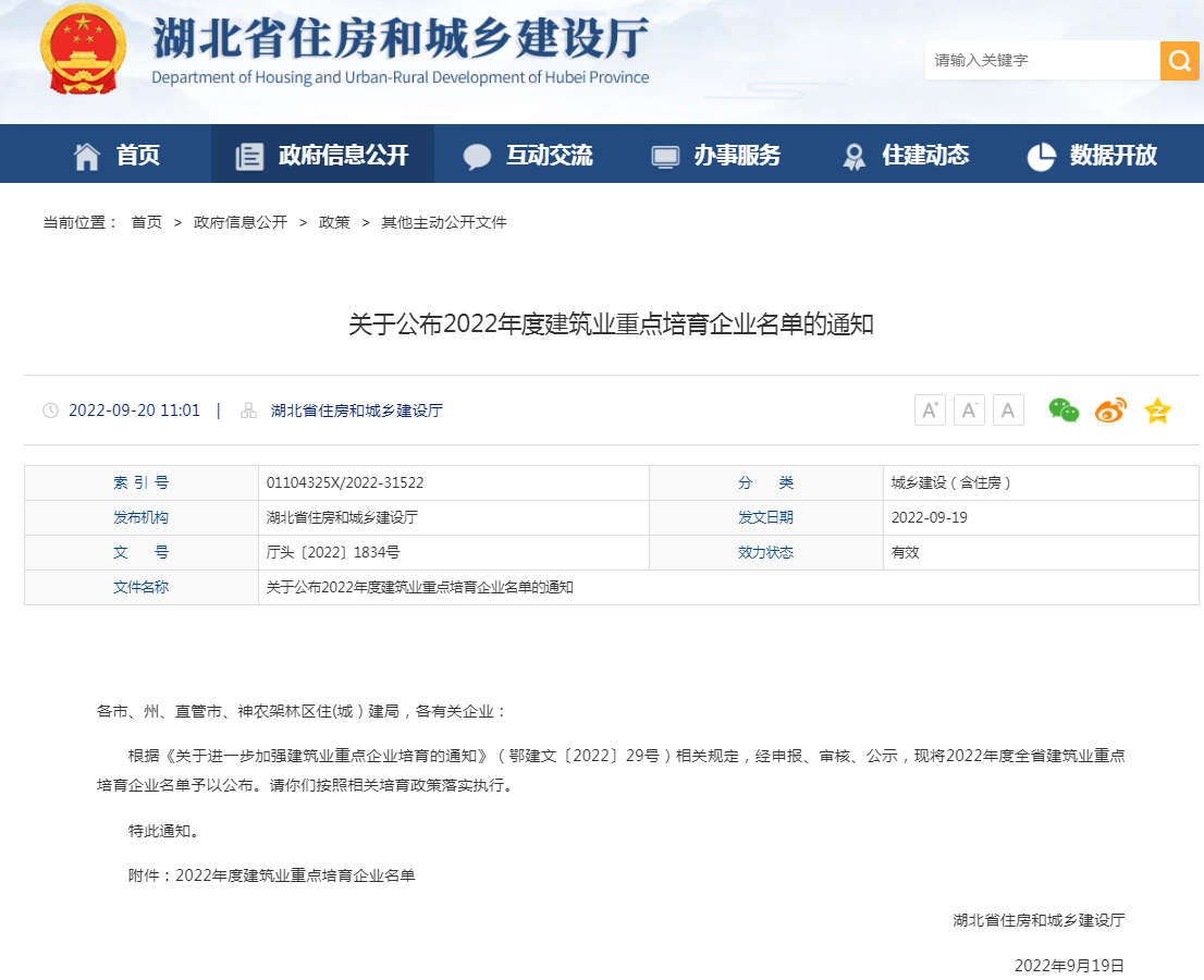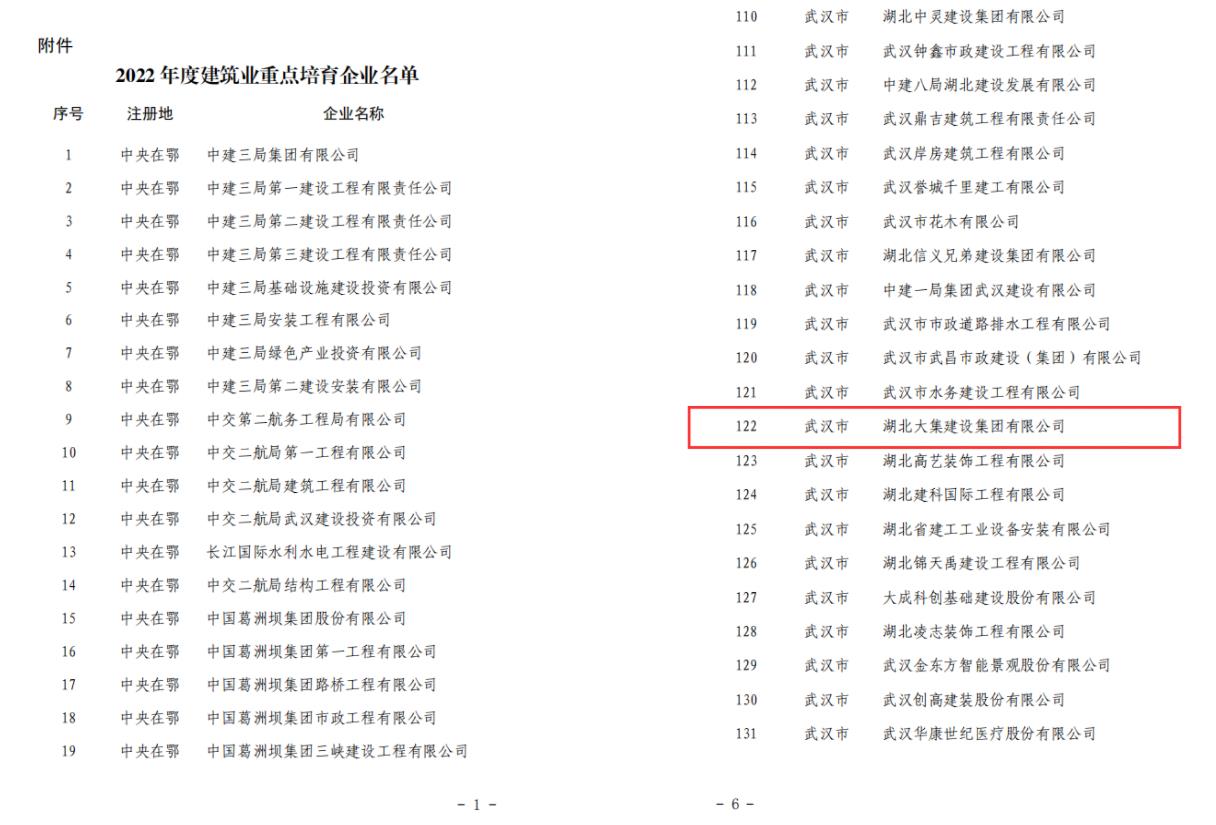 9月20日,湖北省住房和城鄉(xiāng)建設(shè)廳網(wǎng)正式公布湖北省2022年度建筑業(yè)重點培育企業(yè)名單,湖北大集建設(shè)集團(tuán)成功入選!
